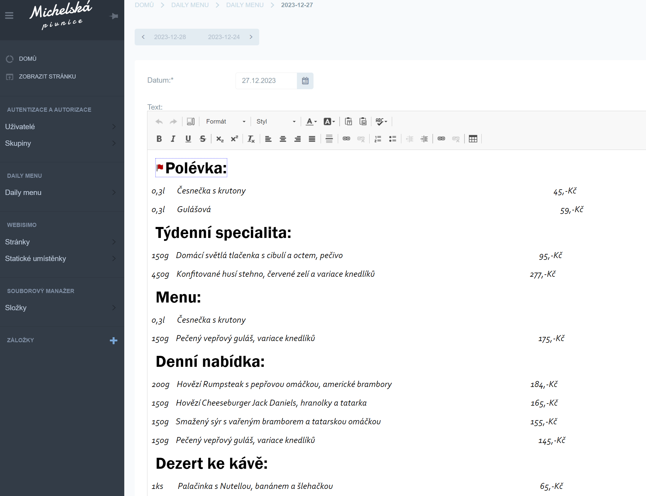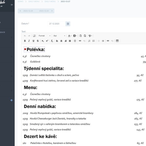 Online demmé menu - vkladíní denního menu jednoduše provozním restaurace, plánování denních menu
